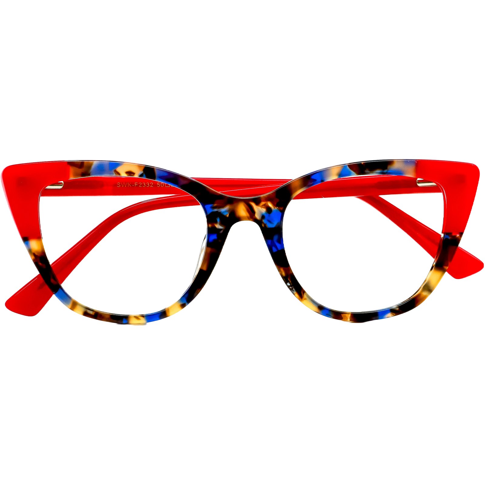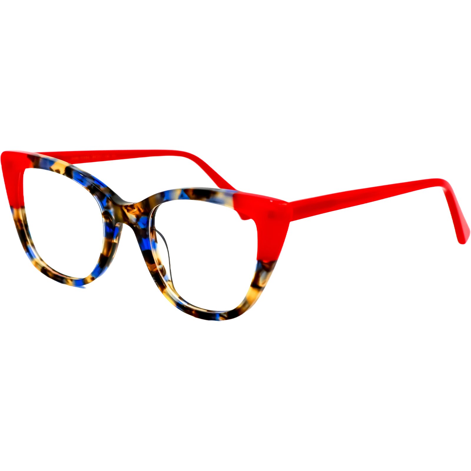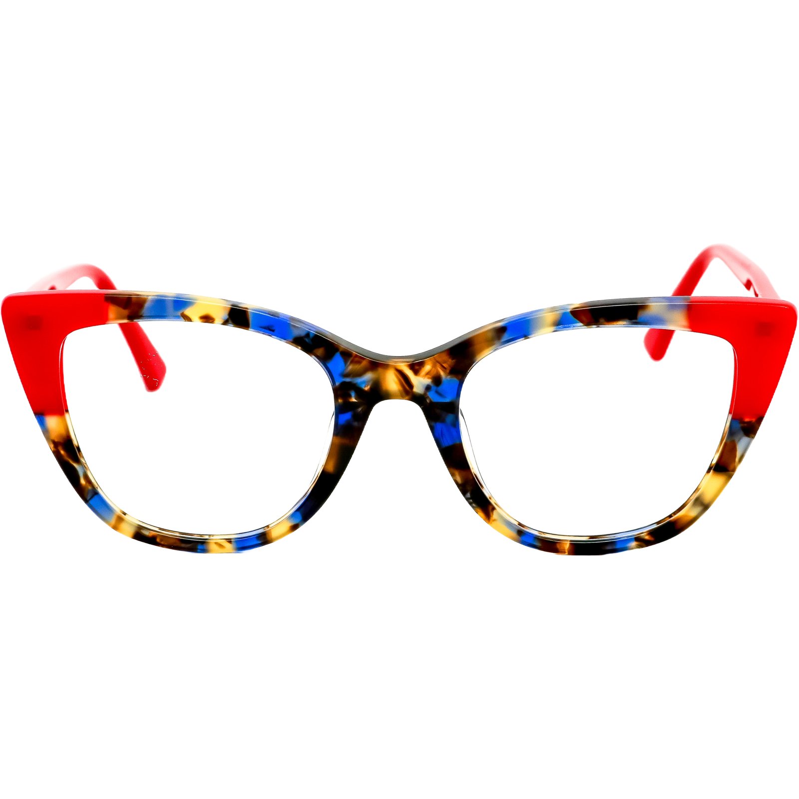 Para a mulher que não segue tendências, mas as cria. Esta armação gatinho é uma explosão de cor e atitude, esculpida em acetato de alta qualidade para um visual inesquecível. O design arrojado é a tela perfeita para uma paleta de cores magnética: a base da armação exibe um padrão tartaruga multicolorido, com toques artísticos de azul e âmbar, que contrasta de forma deslumbrante com o vermelho vibrante e poderoso que domina as hastes e as extremidades superiores.