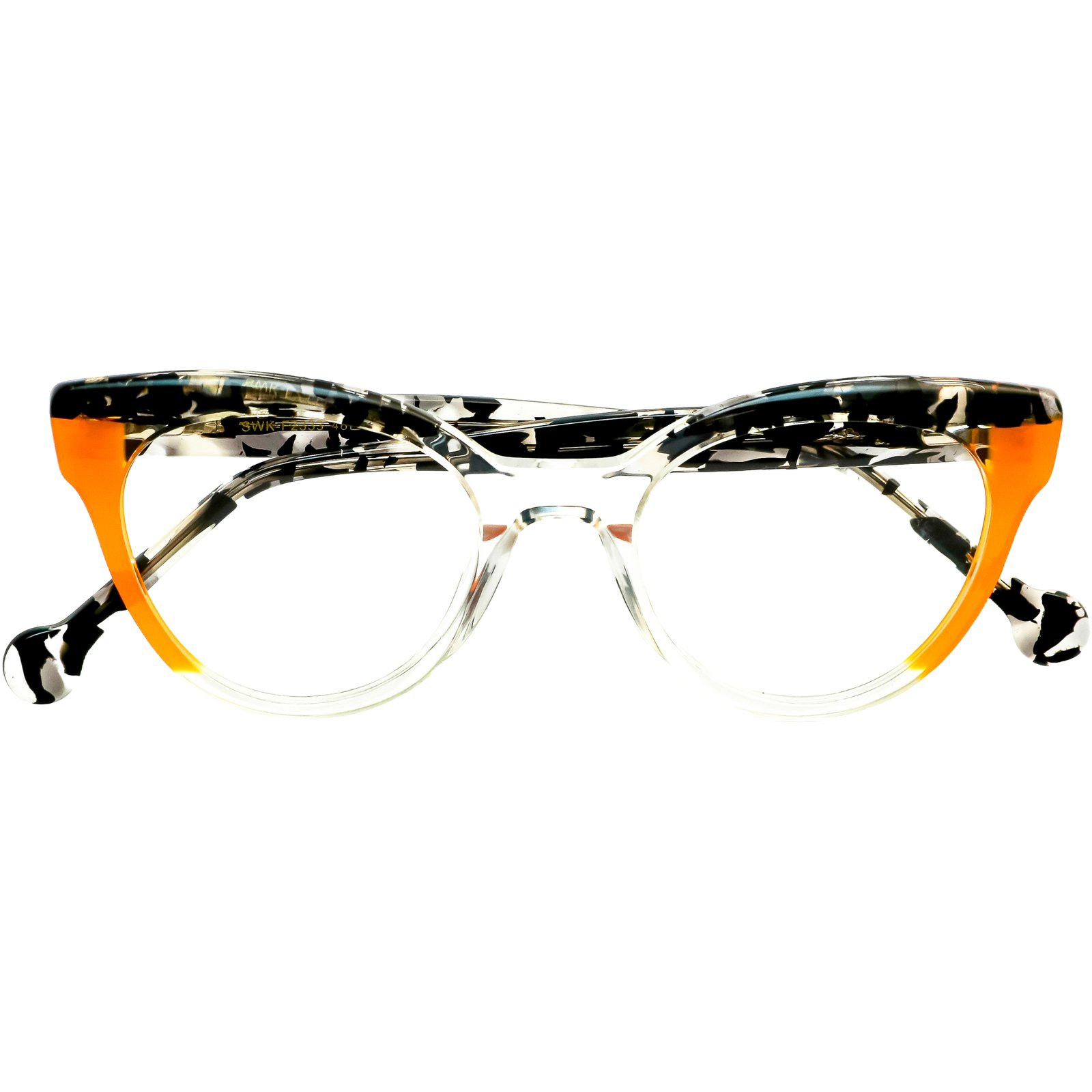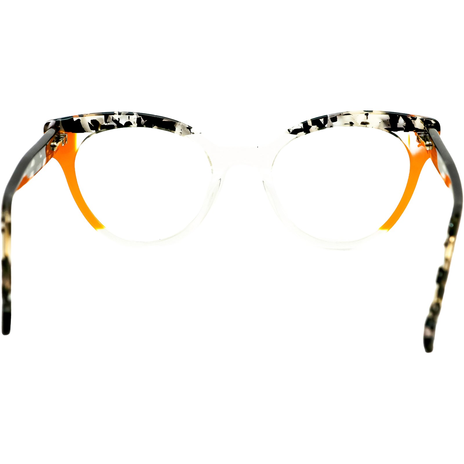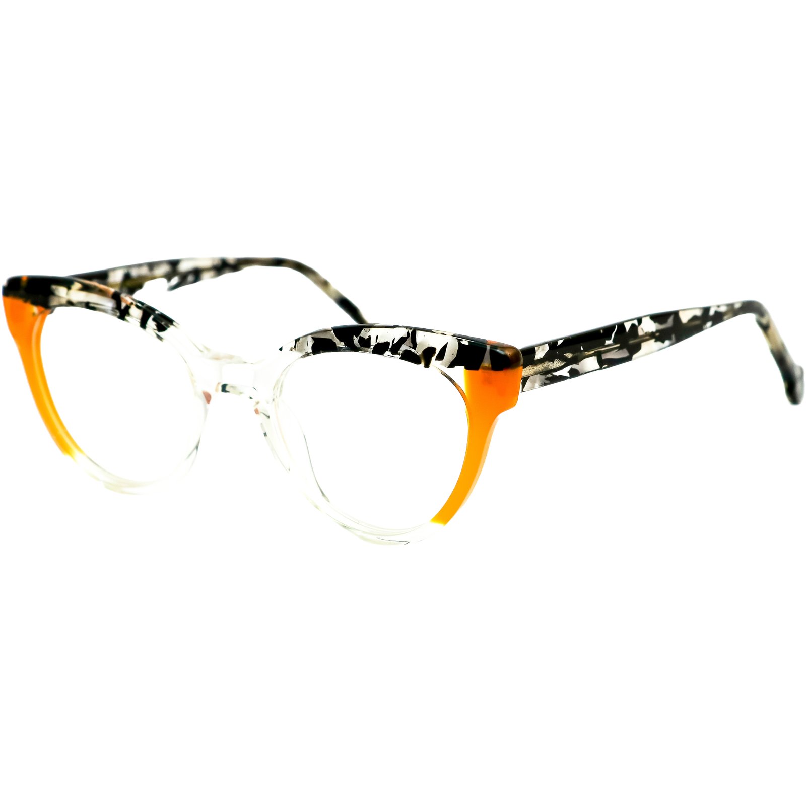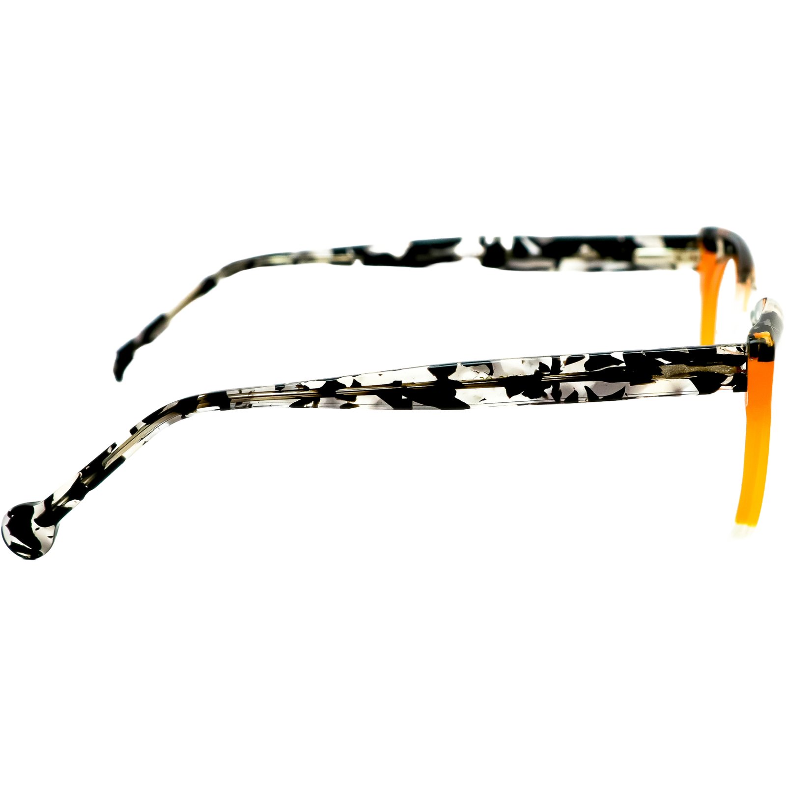 A mágica acontece na fusão de padrões do acetato de alta qualidade: a parte superior e as hastes exibem um padrão abstrato em preto e branco, cheio de personalidade, que é subitamente energizado por um vibrante bloco de cor laranja na parte inferior da armação. O resultado é uma peça de design cheia de vida, arte e sofisticação.