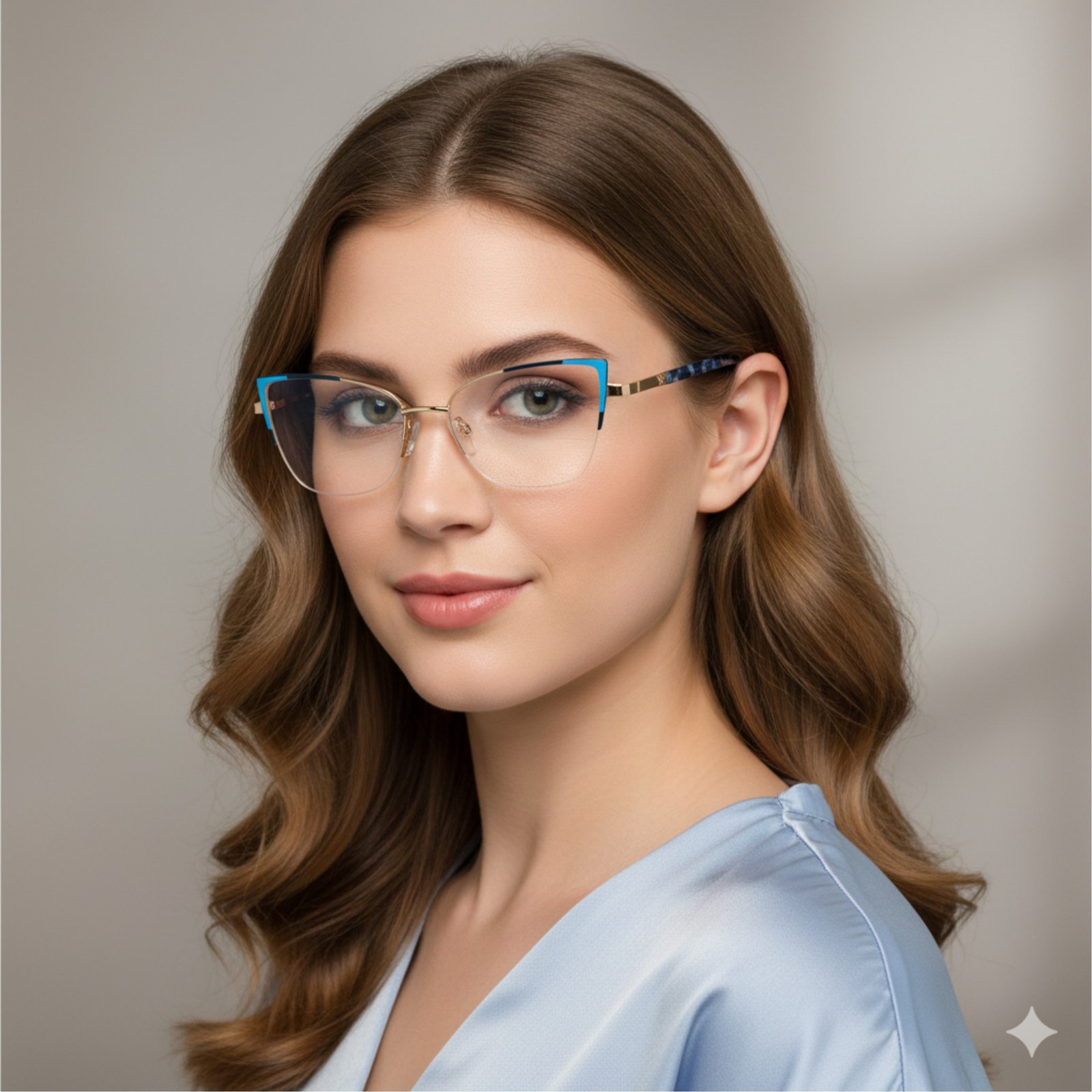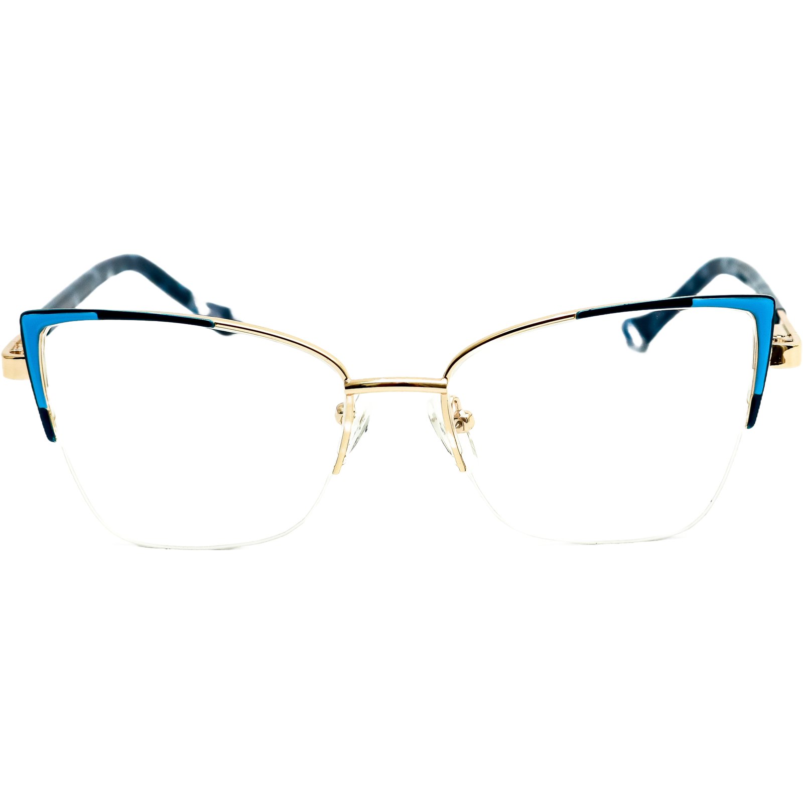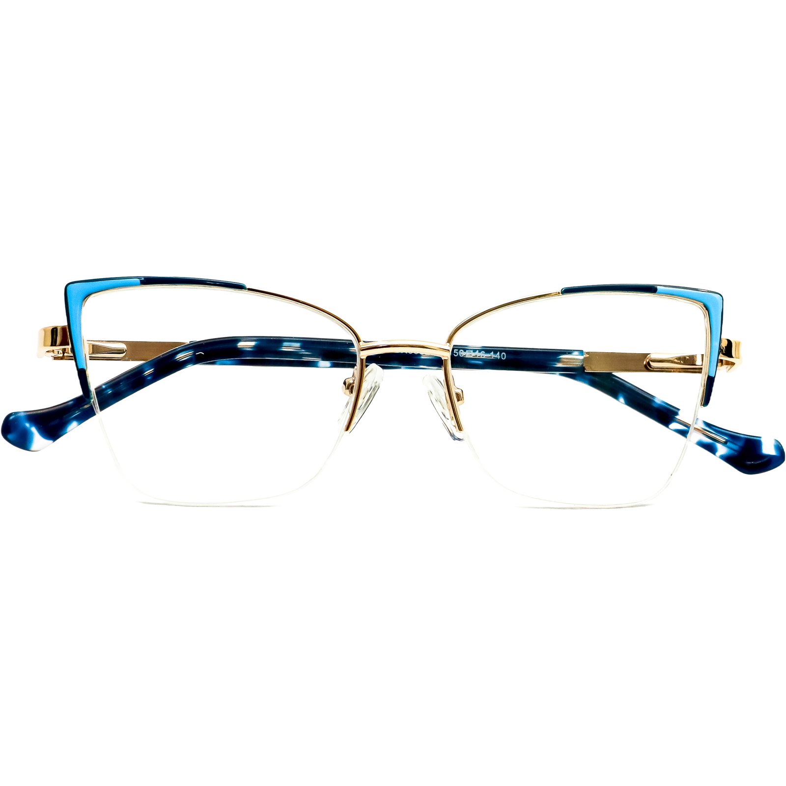 Uma verdadeira joia para o seu olhar. Esta armação feminina combina a sofisticação do formato gatinho com a leveza do design meio aro, criando uma peça de arte funcional. A base em metal dourado serve como uma tela para os detalhes deslumbrantes na parte superior, que mesclam tons de azul turquesa com um elegante efeito tartaruga azulado.