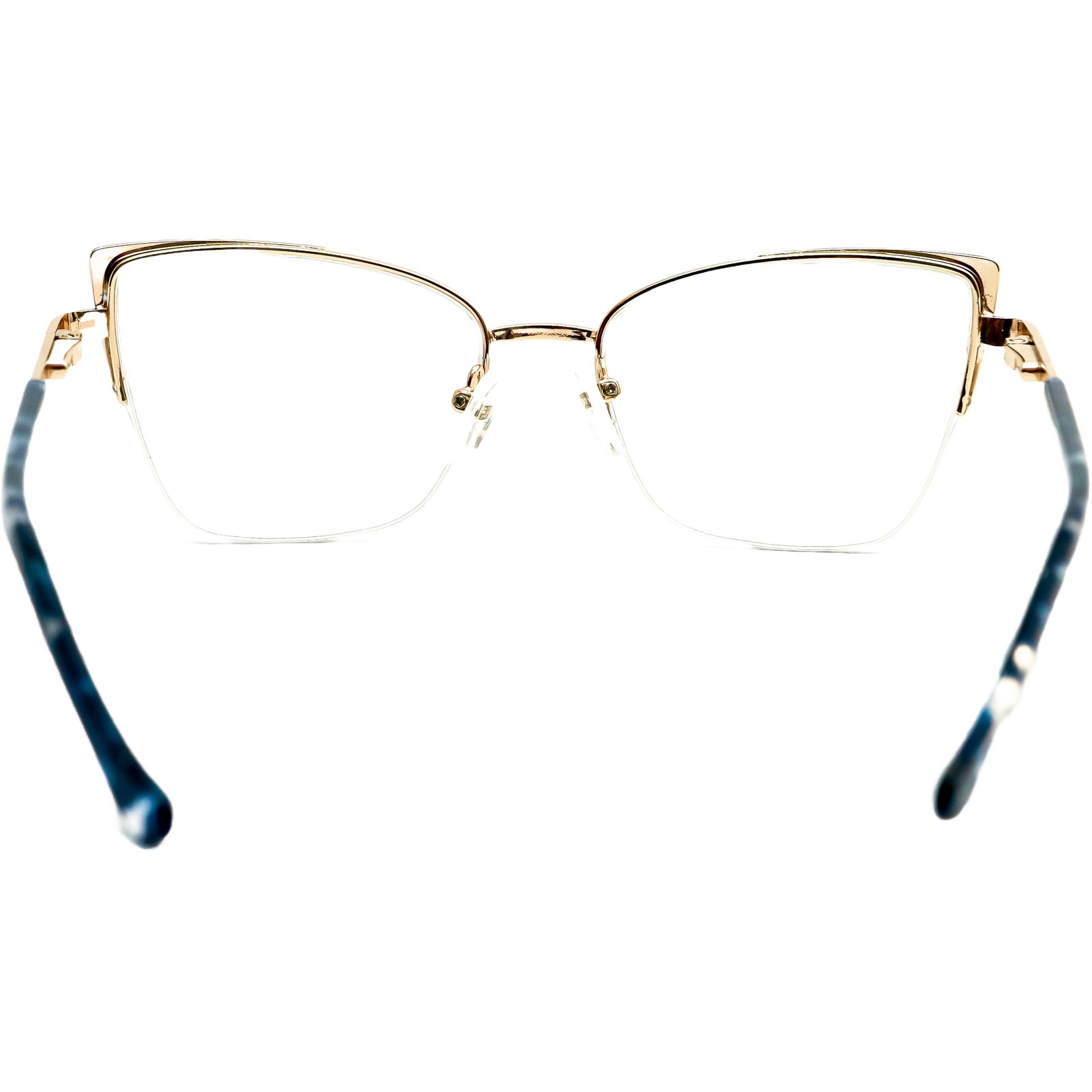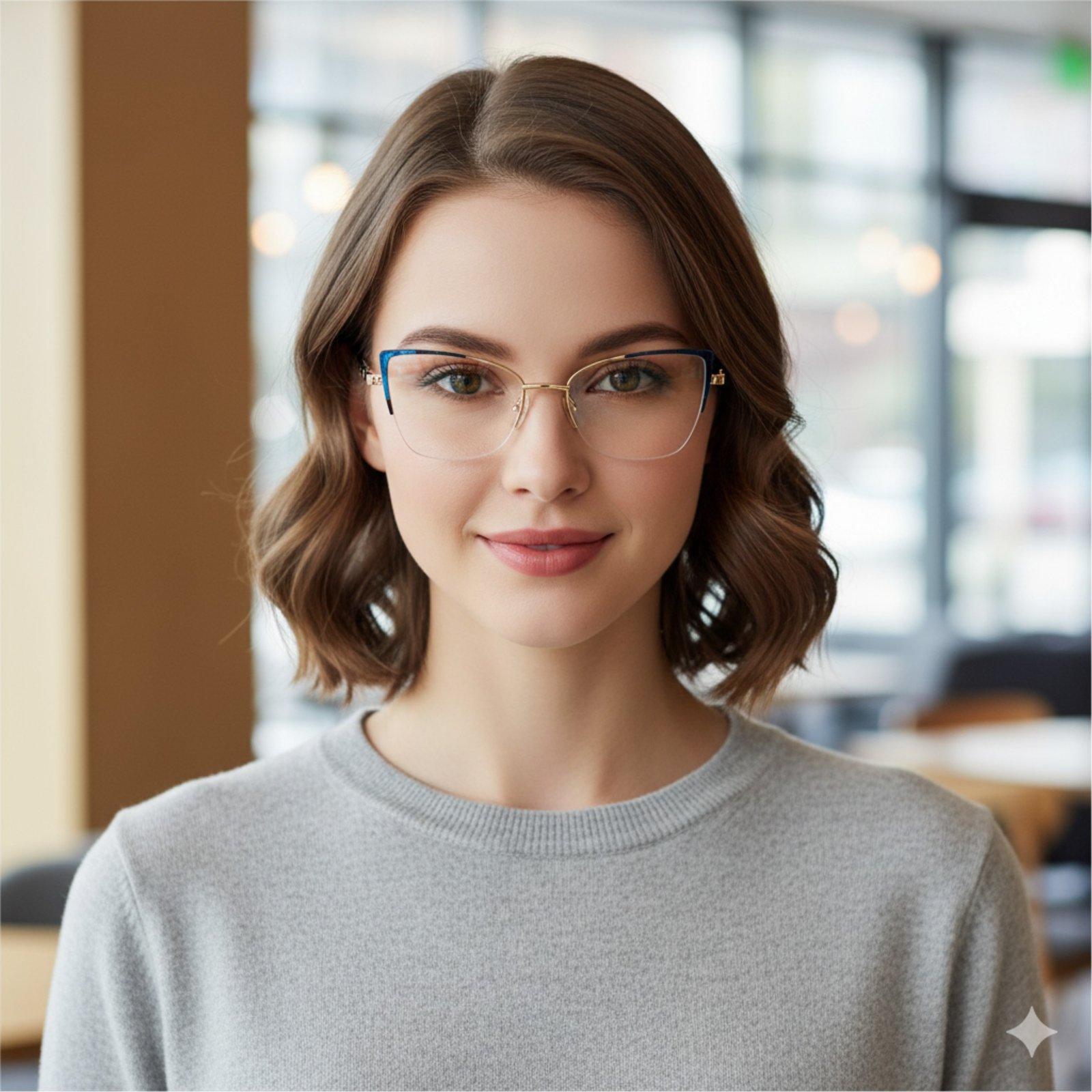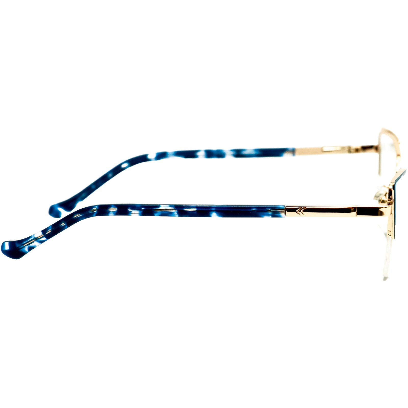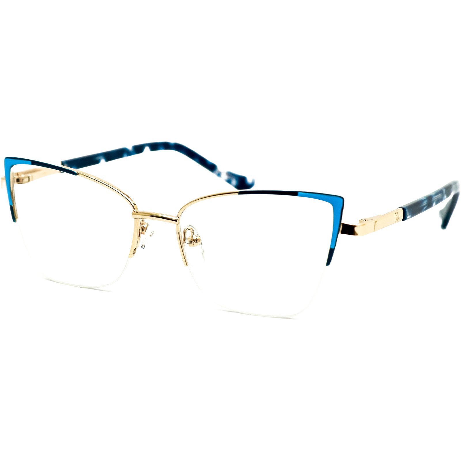 Uma verdadeira joia para o seu olhar. Esta armação feminina combina a sofisticação do formato gatinho com a leveza do design meio aro, criando uma peça de arte funcional. A base em metal dourado serve como uma tela para os detalhes deslumbrantes na parte superior, que mesclam tons de azul turquesa com um elegante efeito tartaruga azulado.