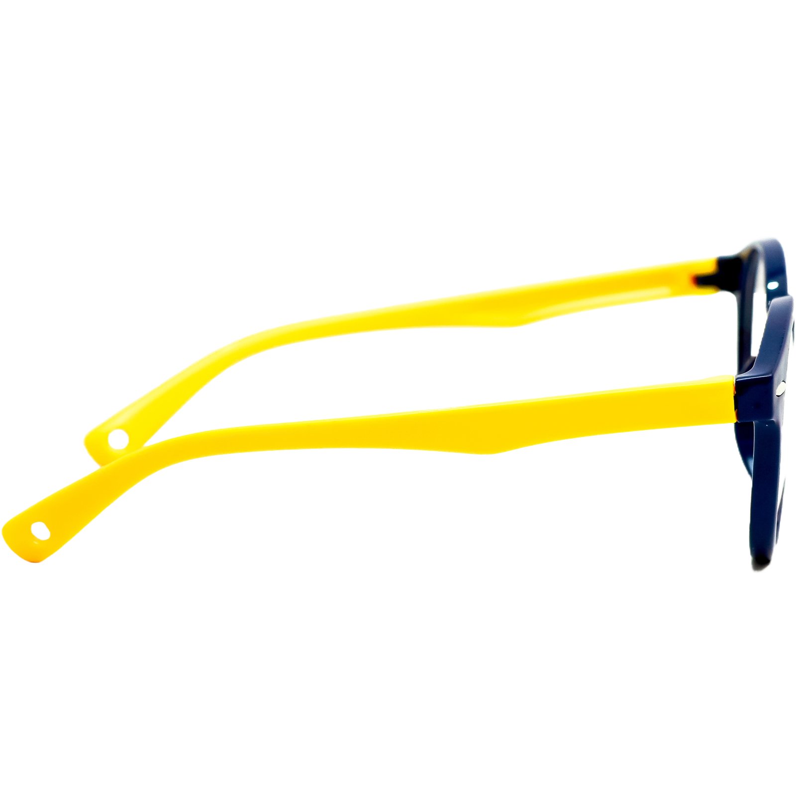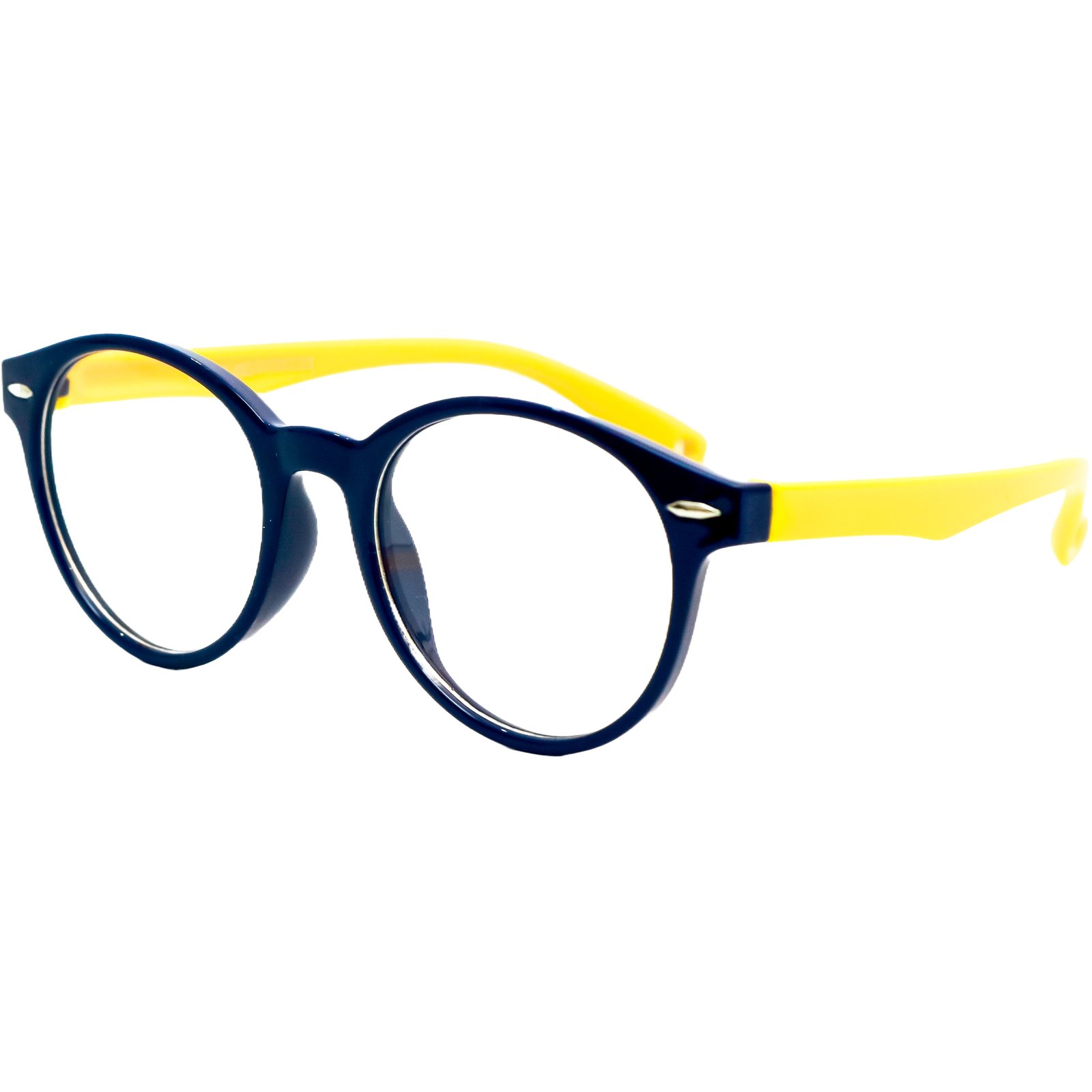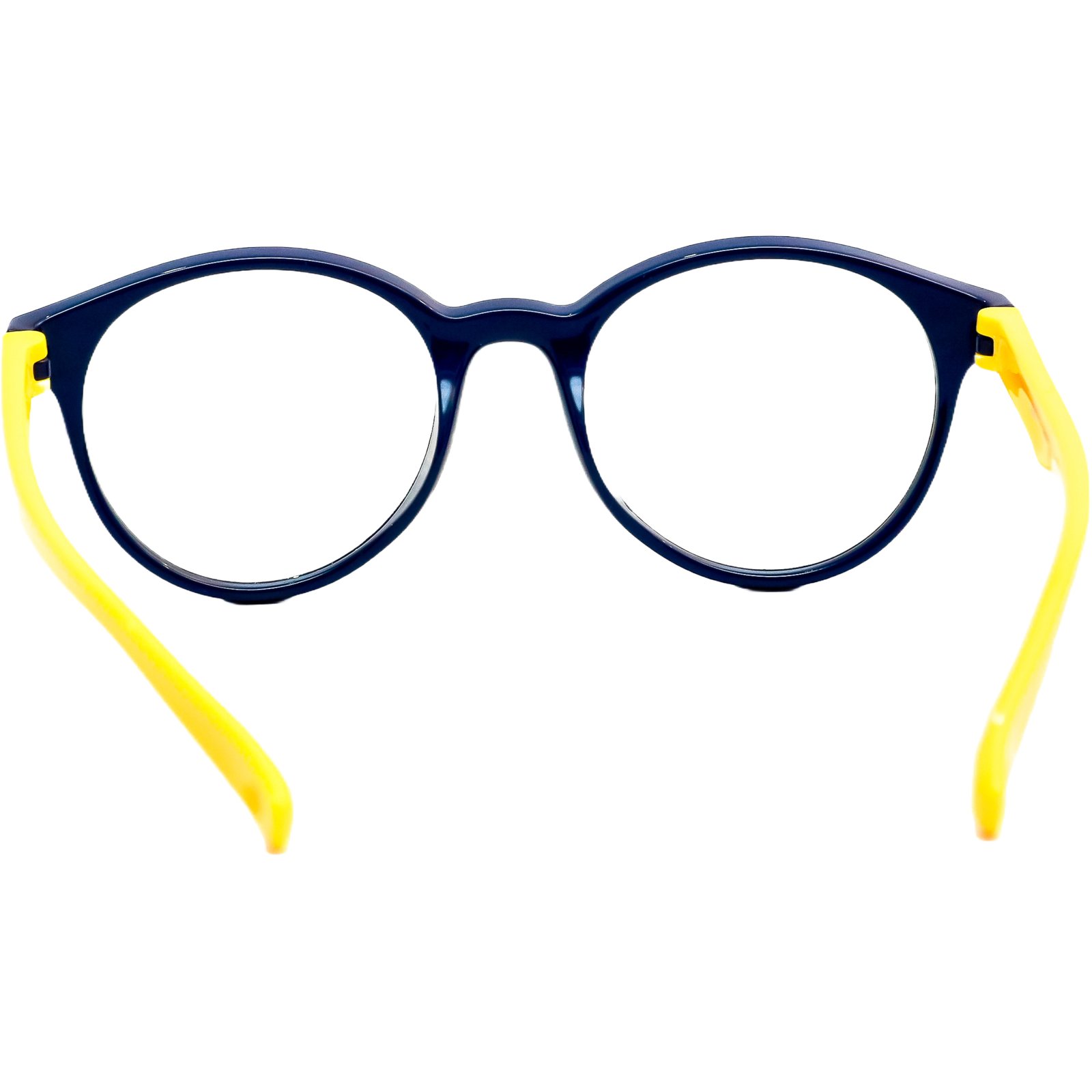 Além de super resistente, é incrivelmente leve, garantindo que a criança se sinta confortável durante todas as horas de estudo e brincadeira. O design redondo é um clássico atemporal, e a combinação de cores, com frente em azul marinho e hastes em amarelo vibrante, é alegre e cheia de energia, incentivando os pequenos a usarem seus óculos com prazer e confiança.