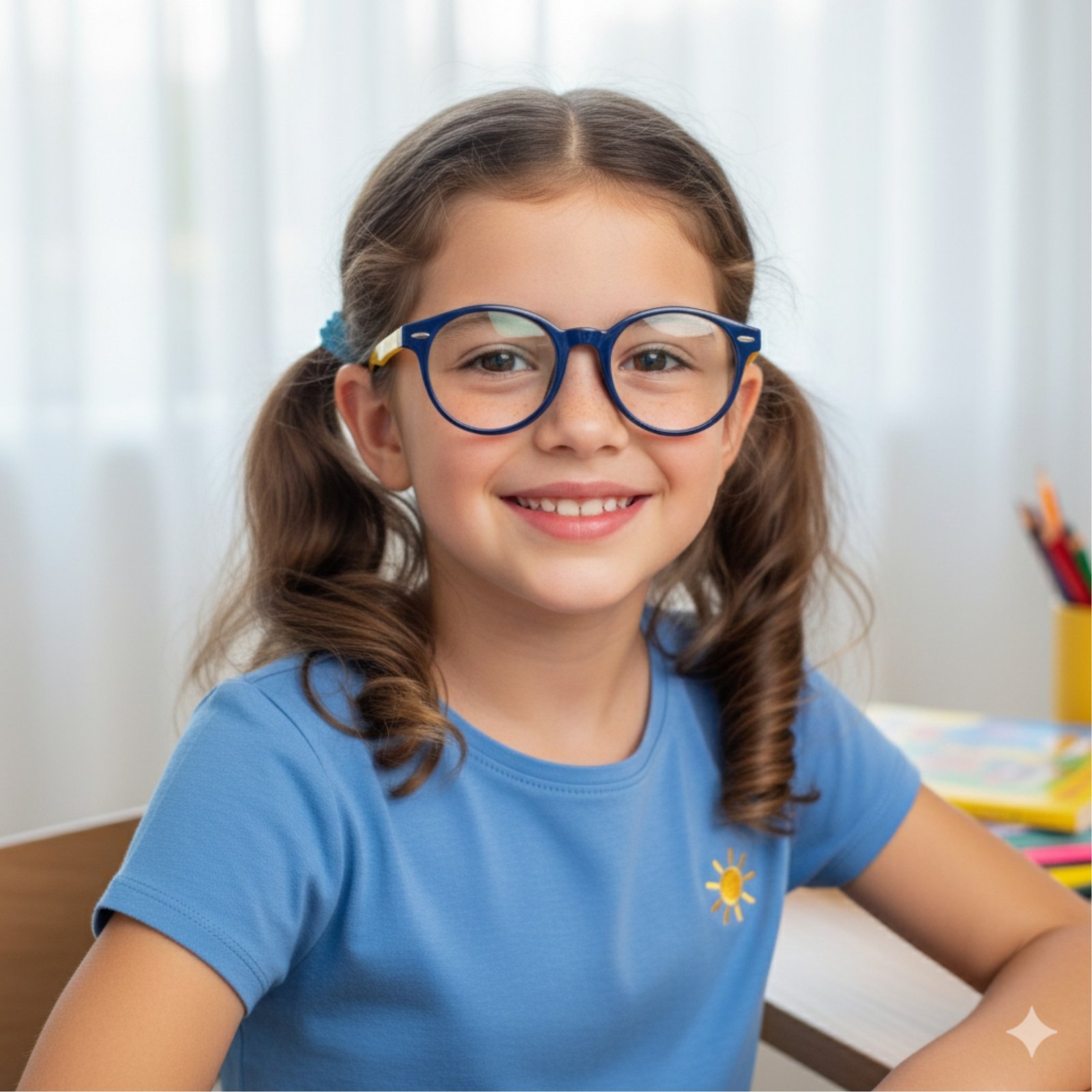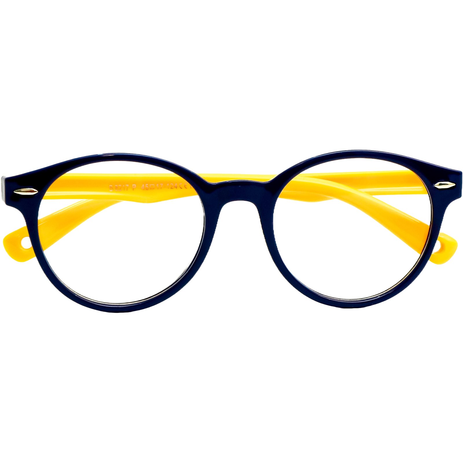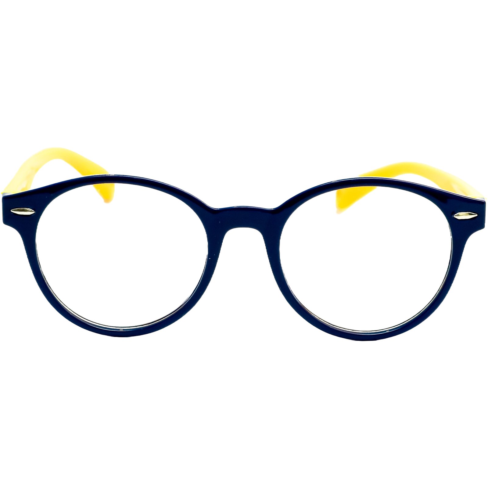 Além de super resistente, é incrivelmente leve, garantindo que a criança se sinta confortável durante todas as horas de estudo e brincadeira. O design redondo é um clássico atemporal, e a combinação de cores, com frente em azul marinho e hastes em amarelo vibrante, é alegre e cheia de energia, incentivando os pequenos a usarem seus óculos com prazer e confiança.