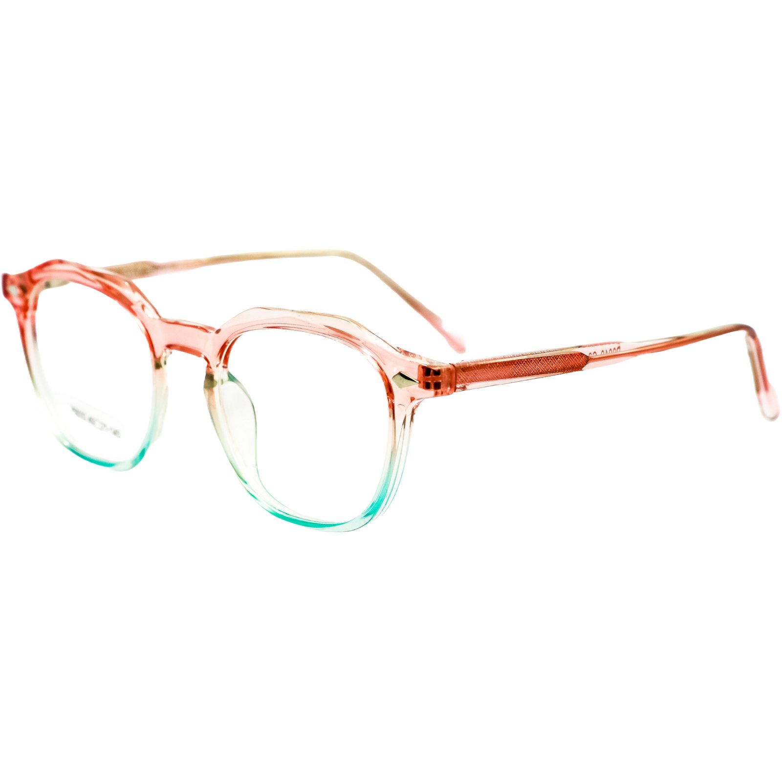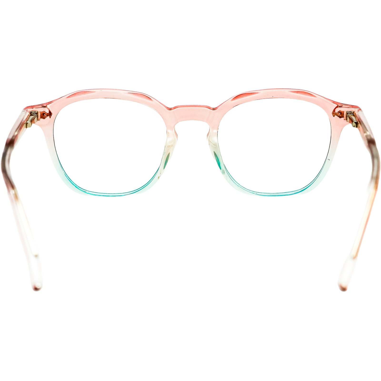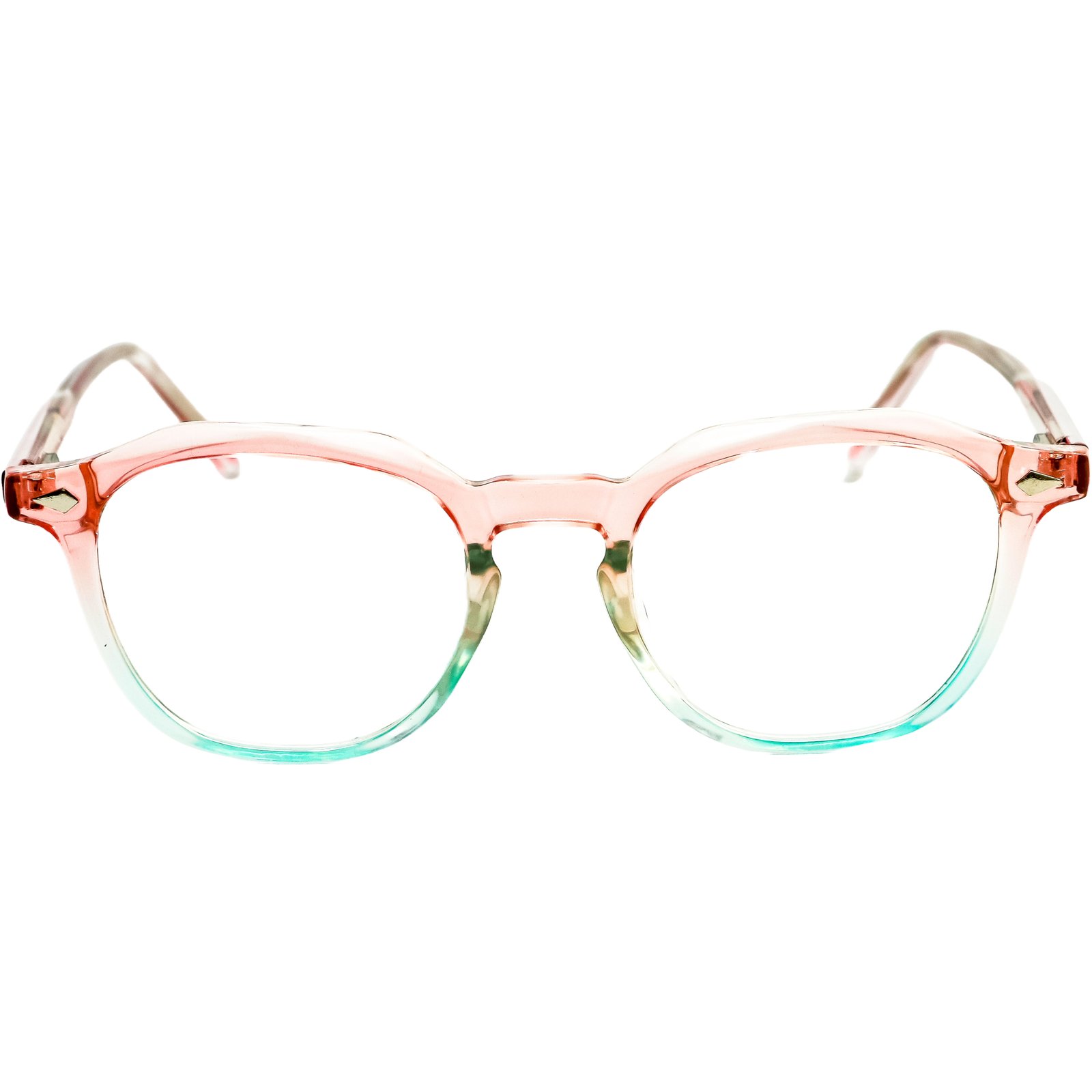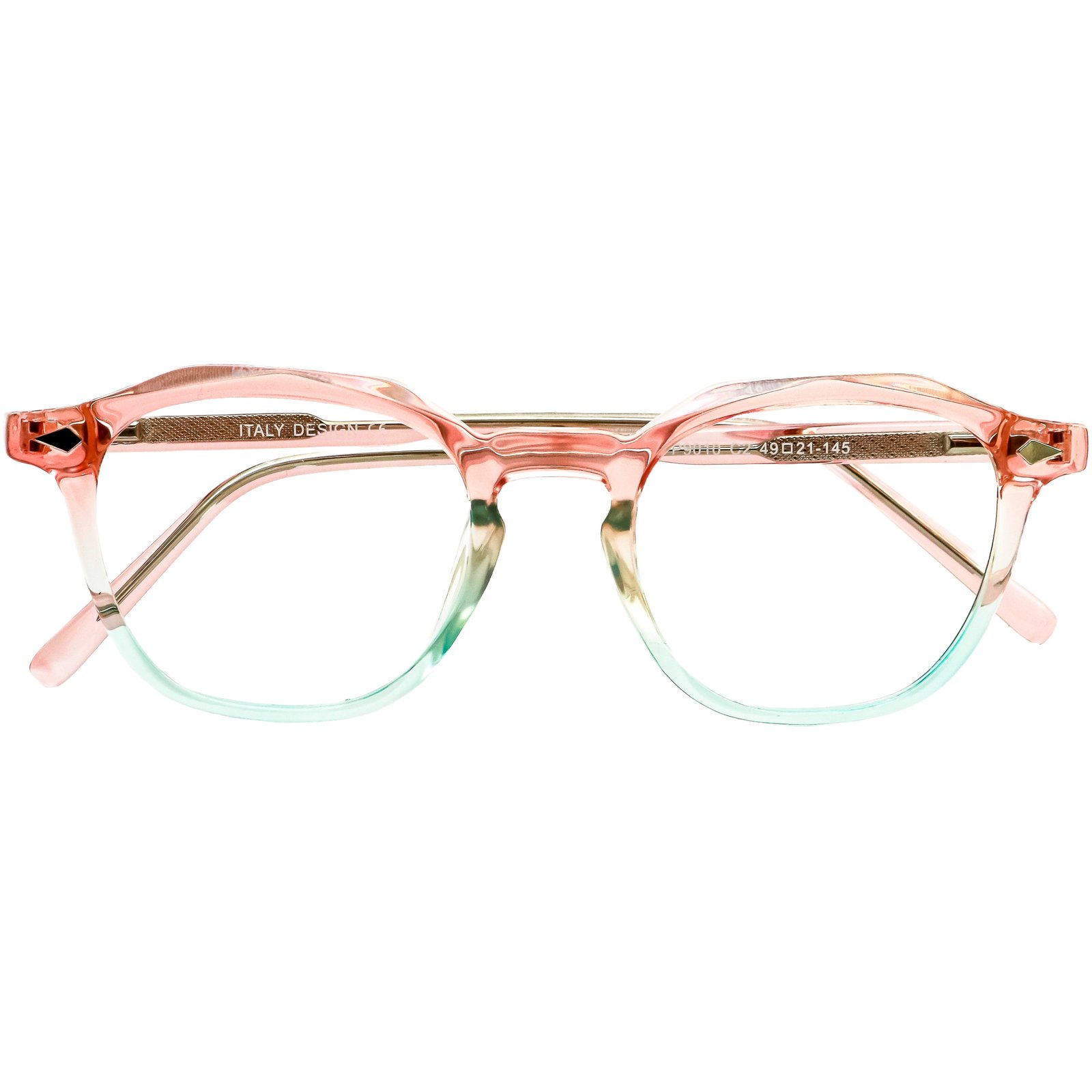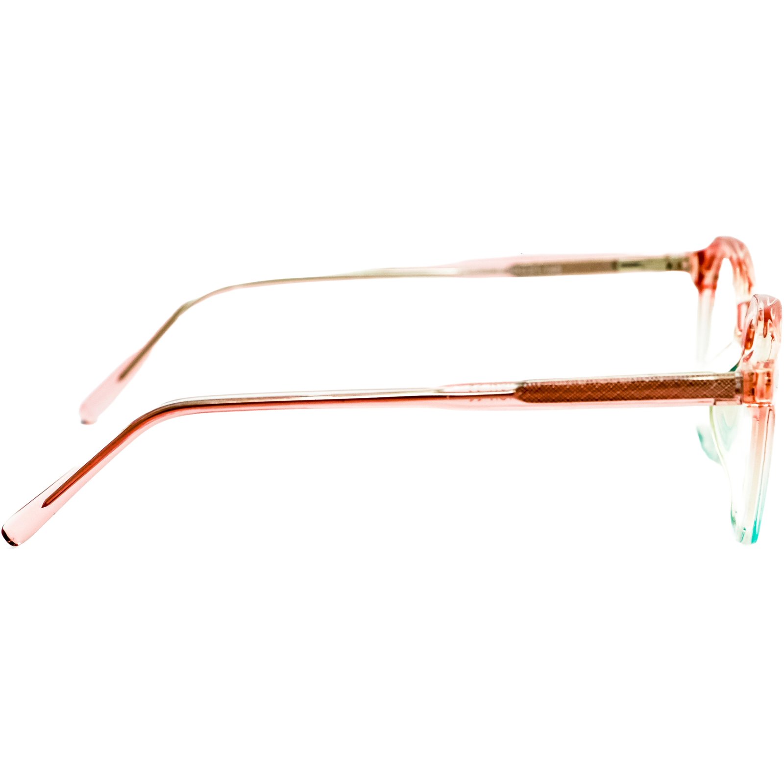 Inspirada no design italiano, esta armação é uma verdadeira obra de arte em acetato. O formato geométrico arredondado, um clássico moderno, ganha um toque extra de sofisticação com suas bordas suavemente facetadas. O grande destaque é o deslumbrante efeito degradê, que flui de um delicado rosa translúcido no topo para um refrescante verde menta na base, criando um visual único e cativante.