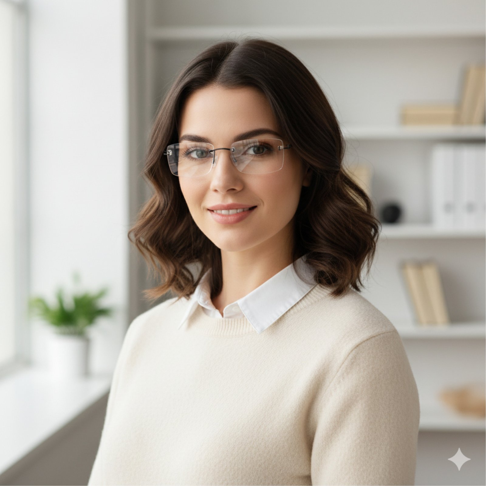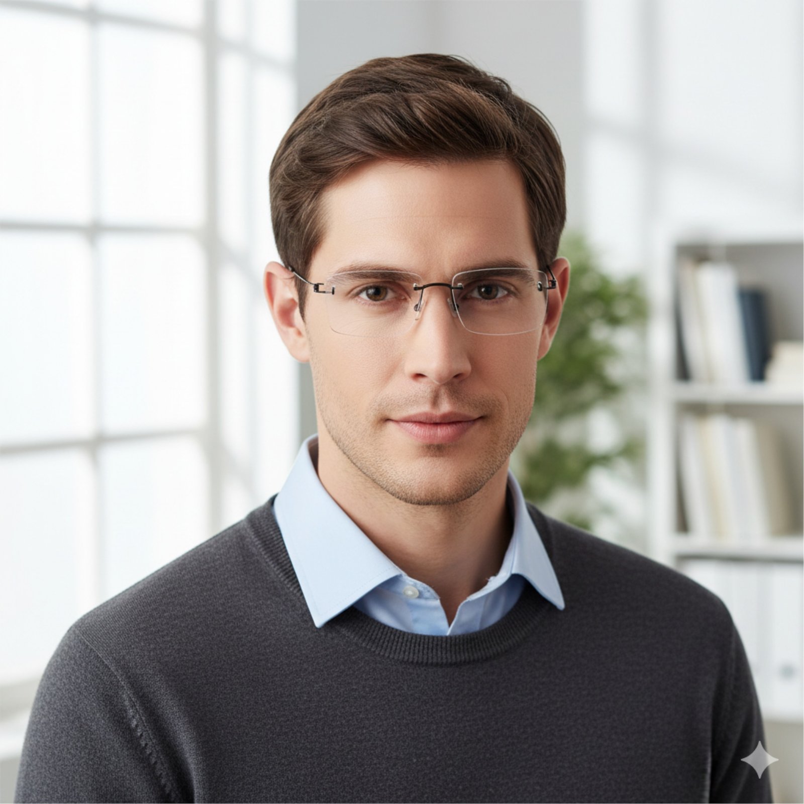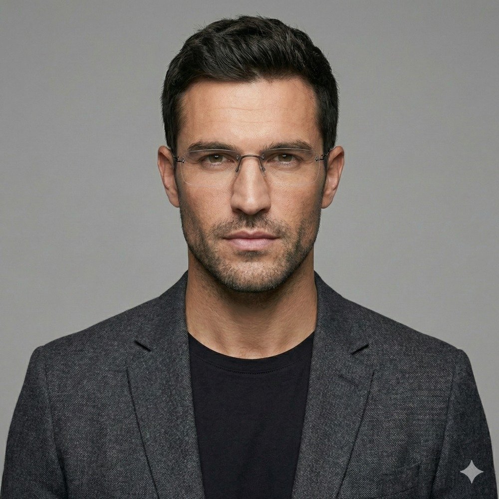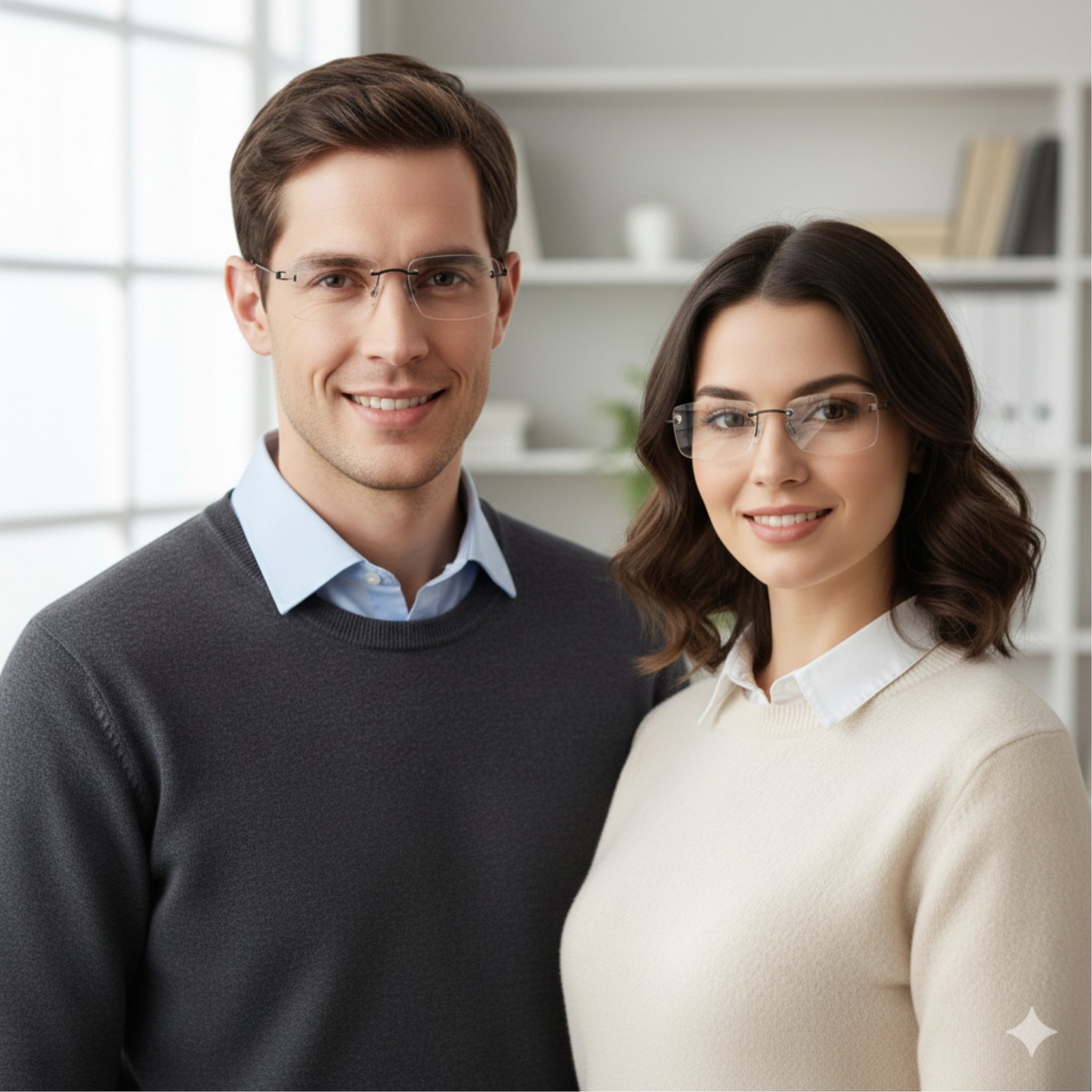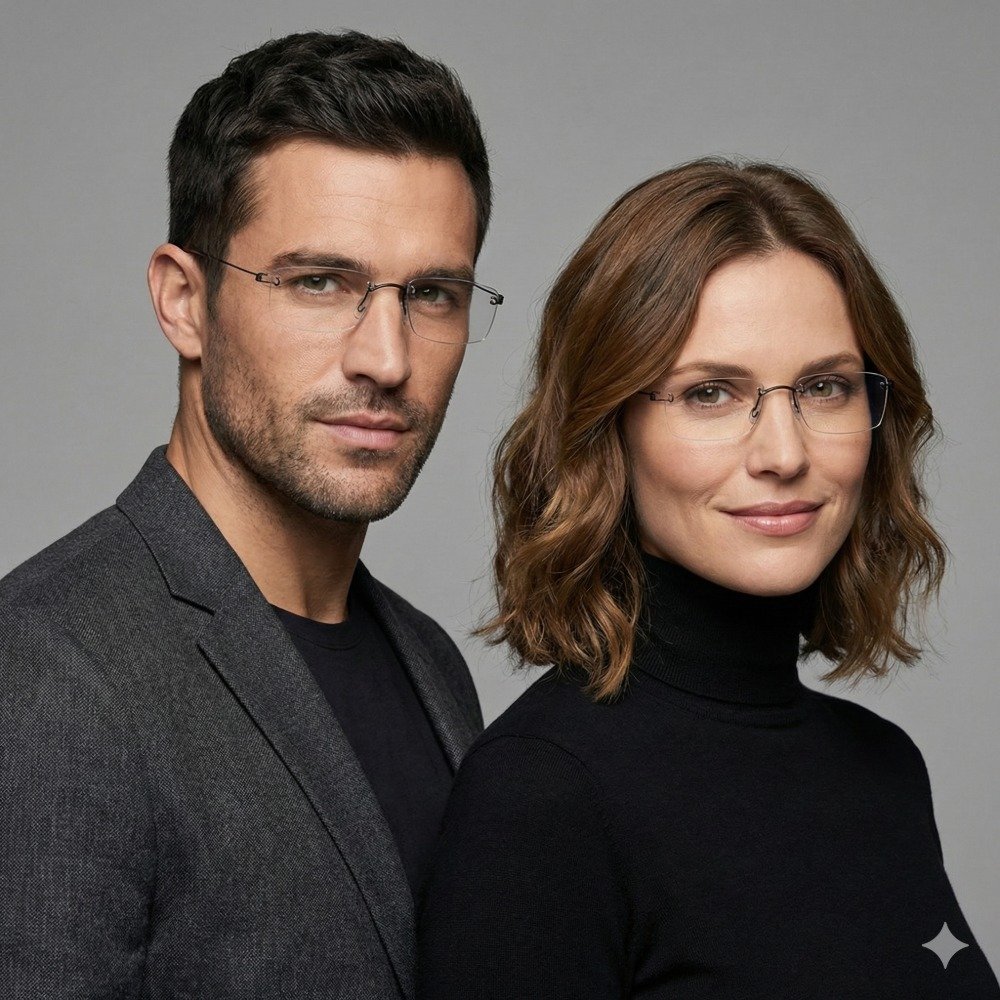 Titânio Peso-Pluma: O material hipoalergênico é tão leve que você esquecerá que está usando óculos. O design flutuante (sem aros) oferece um visual limpo e intelectual, perfeito para ambientes corporativos ou uso doméstico.